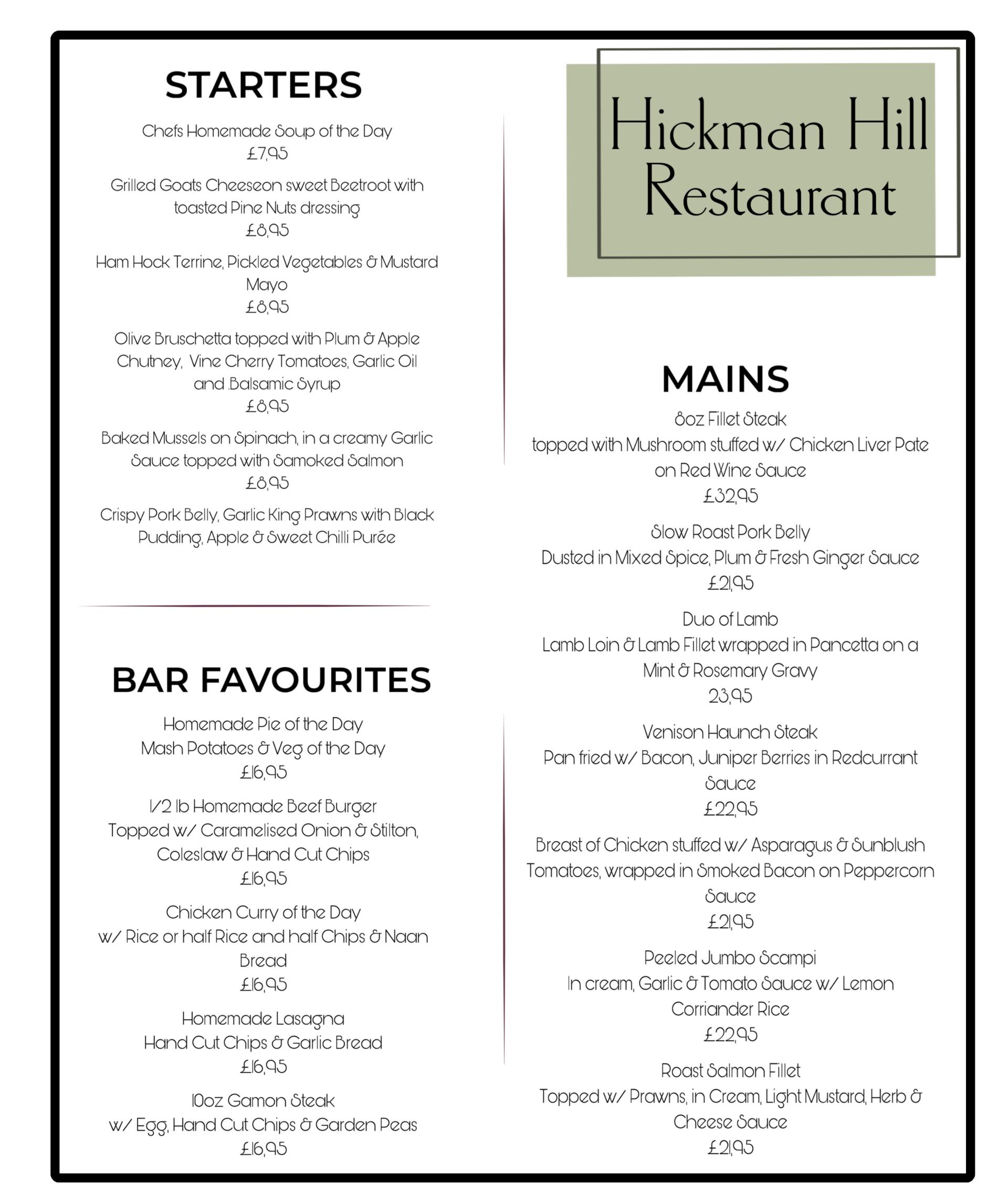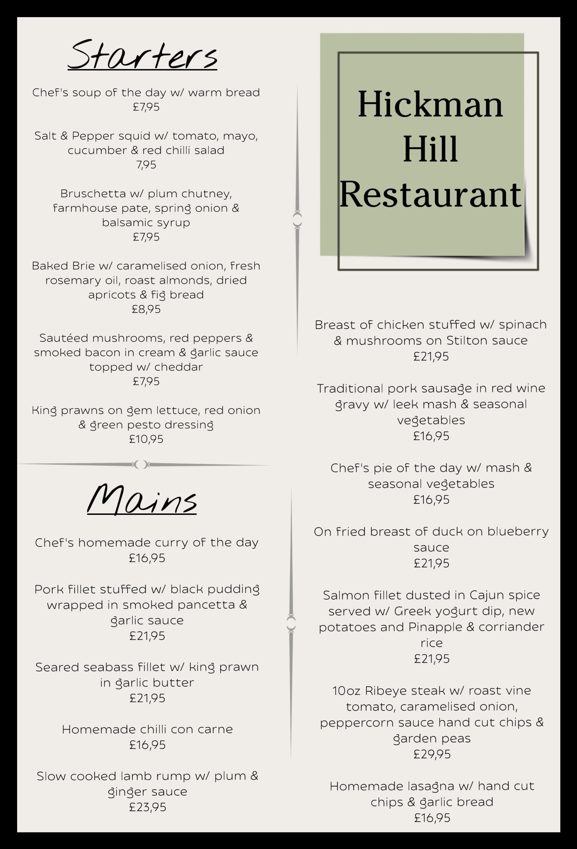Welcome to the Hickman Hill Restaurant, where every dish tells a story of passion and flavour. Nestled in the heart of Gainsborough, our restaurant offers a haven for food enthusiasts seeking an unforgettable dining experience.